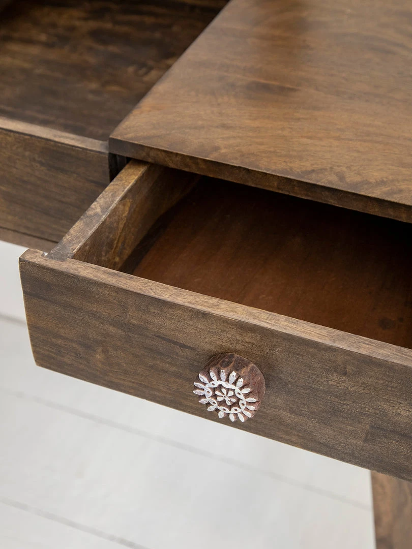 The Bungalow Vanity is such a pretty piece for the home! It features a mirror that opens up with the cutest trim around it and two drawers for storage with hand-carved block print drawer pulls! It will bring a bohemian and rustic touch to your space! The most special part is the drawer pulls, they are so unique and we discovered them during our global travels! It’s a stained mango wood, and there will be slight variations in wood color and grain. Each piece is uniquely one of a kind! Assembly is required and instructions and hardware are included.