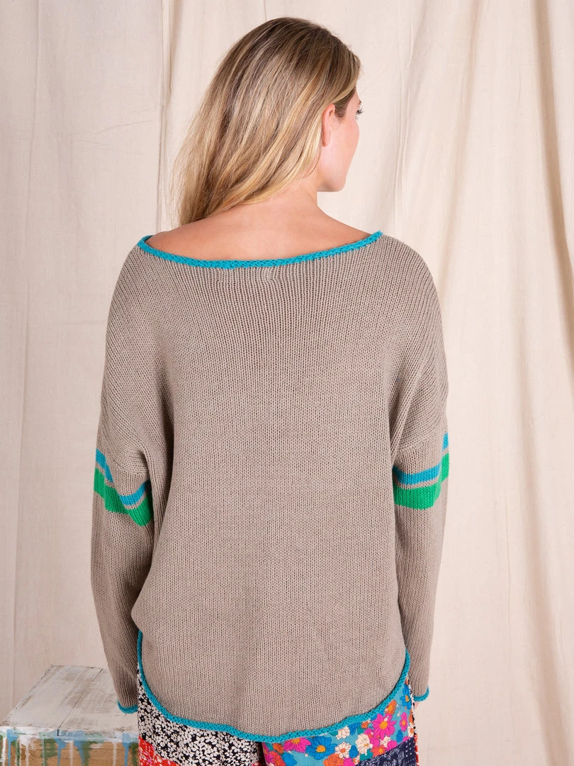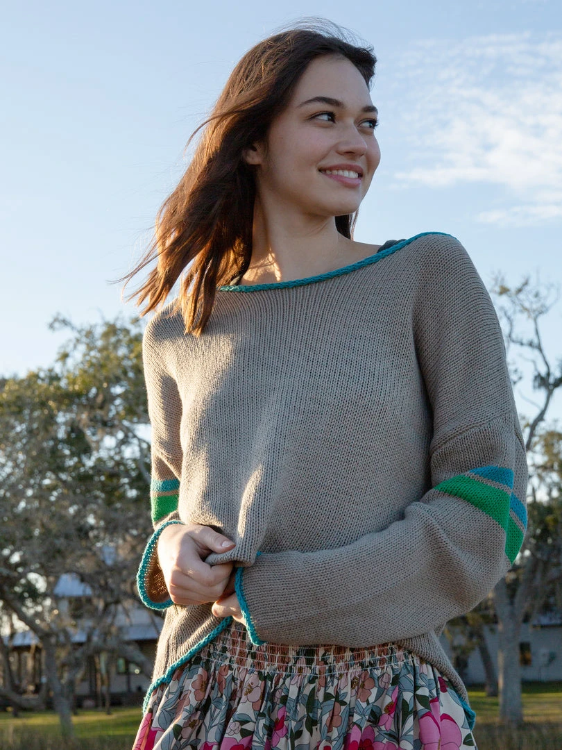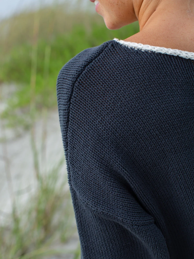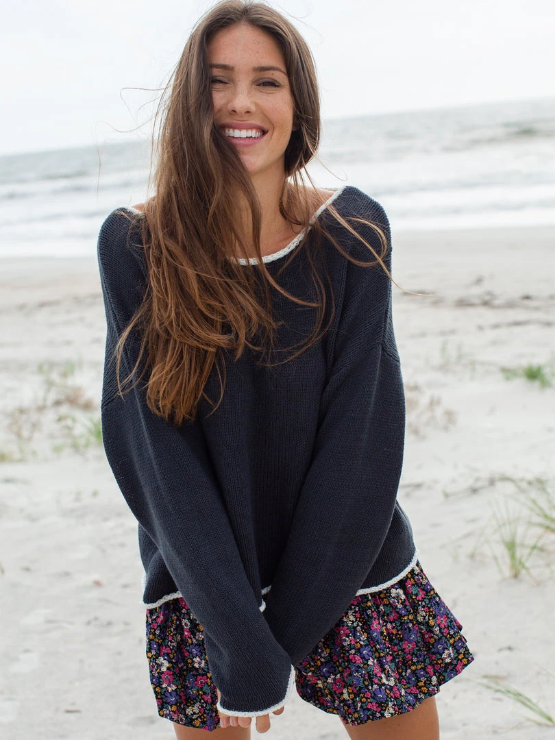 You can never have too many easy pullover sweaters! This summer sweater is lightweight and features a special intarsia contrast stitching. The fit is relaxed and oversized, making it so comfy… and it’s perfect for the beach to throw on over your bathing suit! Wear it alone during warmer weather days and layer with a long sleeve tee and jacket for cooler days!