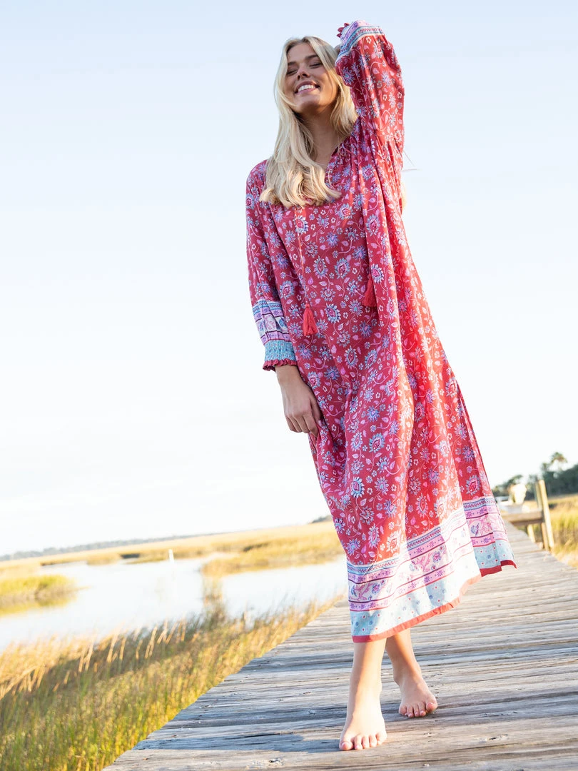 You loved the Dara Mini Dress so much, we had to make a Dara Maxi… and it’s so beautiful! It features a v-neckline with tassel ties, smocked sleeve openings & a pretty border print! It’s lightweight, making it so comfy and easy to wear – literally anywhere!