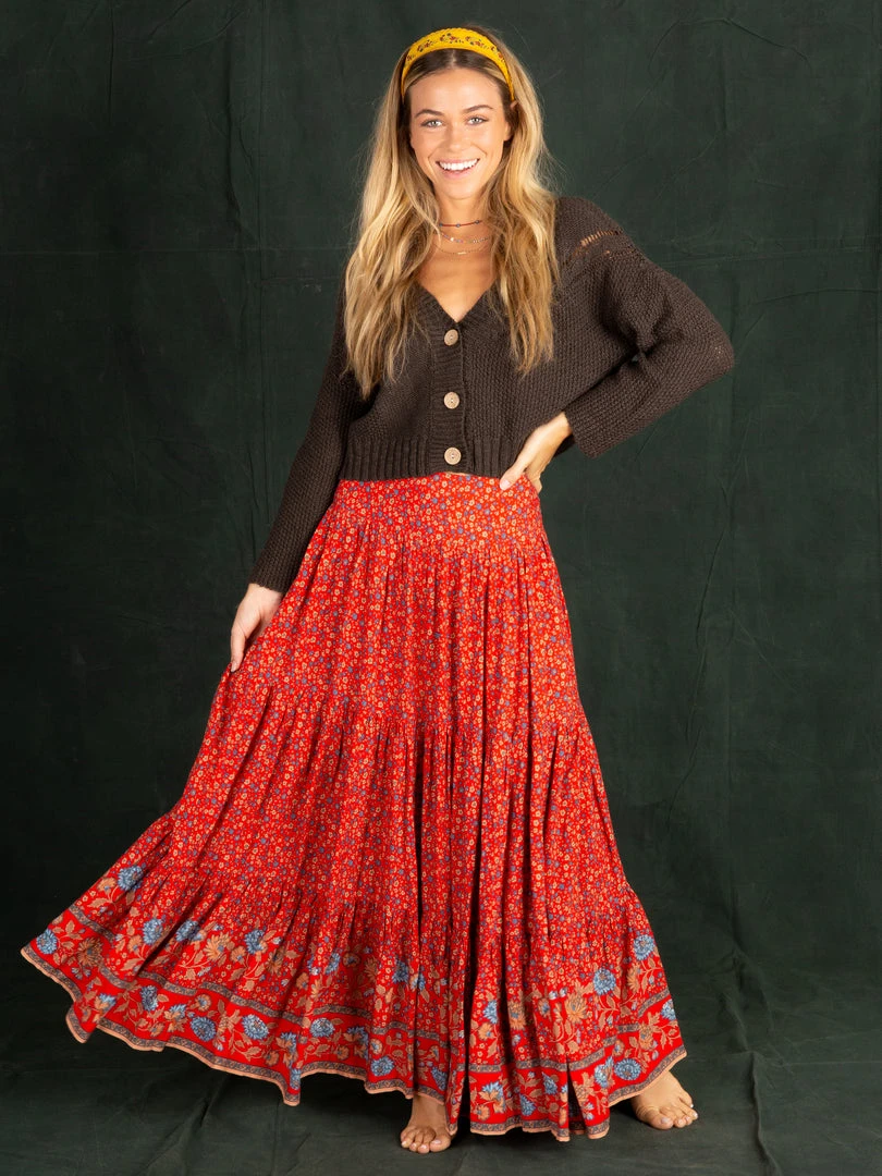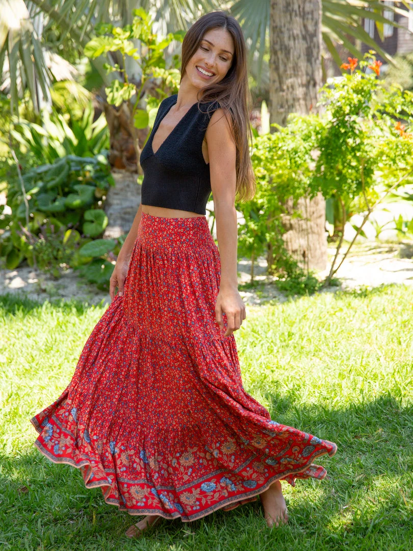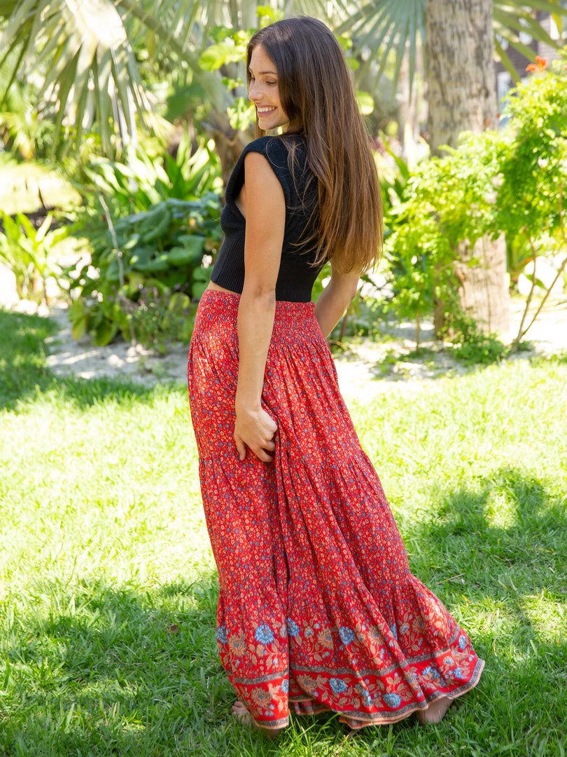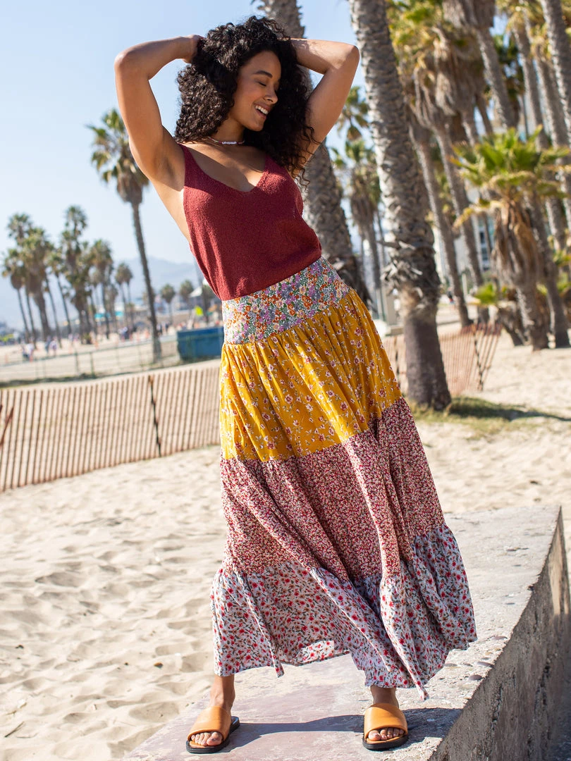 The Hanna Maxi Skirt is one of our most loved skirts! The bohemian mixed prints, billowy tiers and wide waistband with smocked elastic in the back makes it incredibly flattering and effortless. It’s such a pretty skirt that you can’t help but feel beautiful in it!