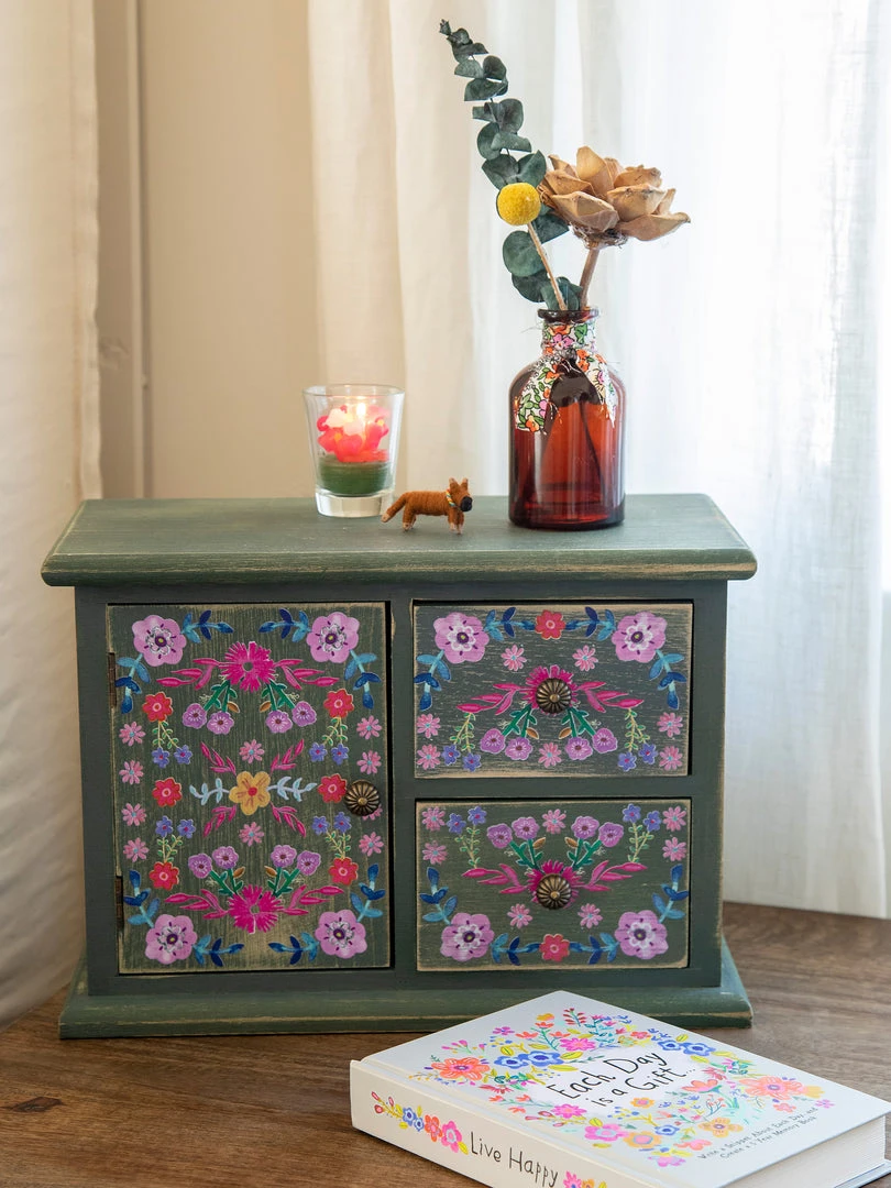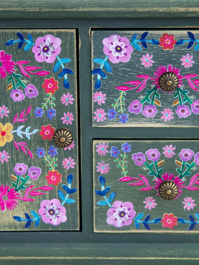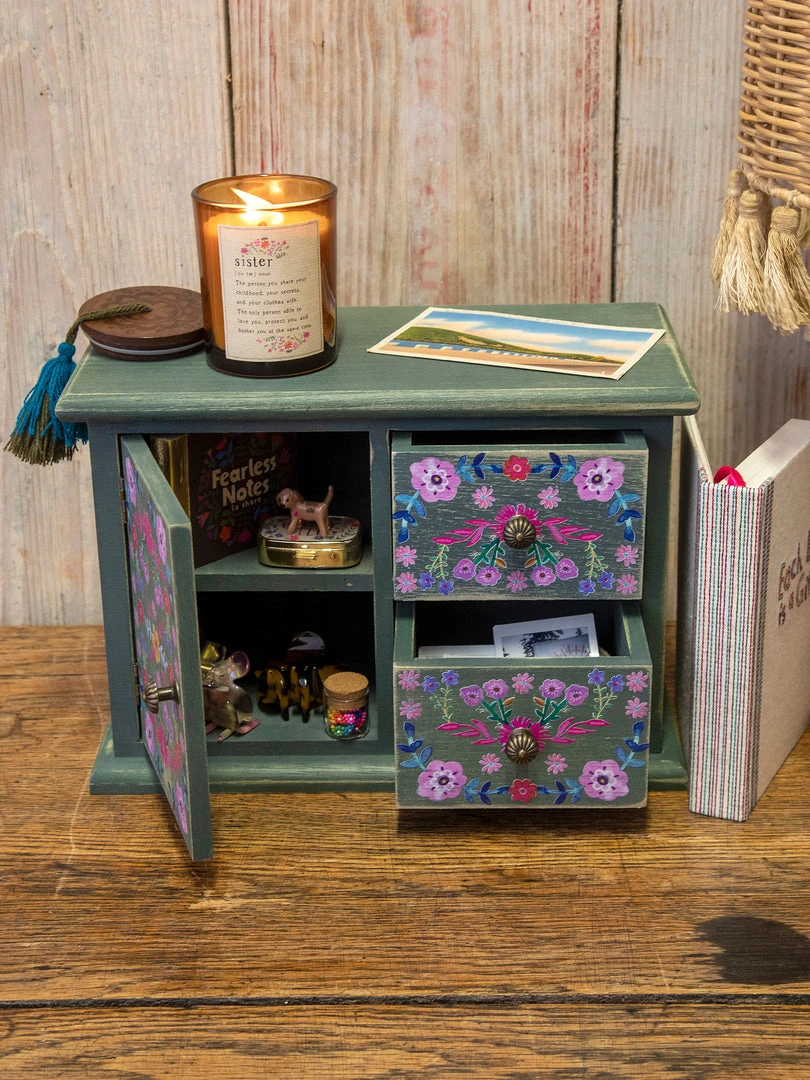The Maia Mini Dresser is the cutest mini dresser to put on your big one! It features a pretty painterly floral design and rustic wood finish. It has 2 drawers and a cabinet door with a shelf to hold your favorite little keepsakes, jewelry & hair accessories! It makes a super sweet gift for someone you love, too!