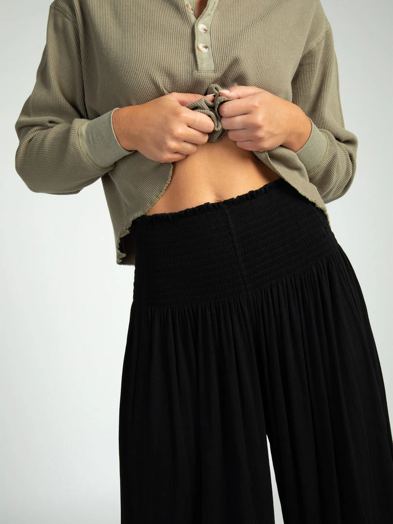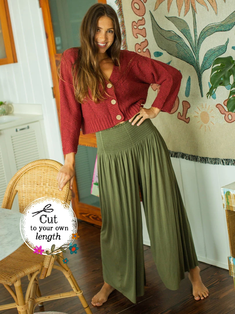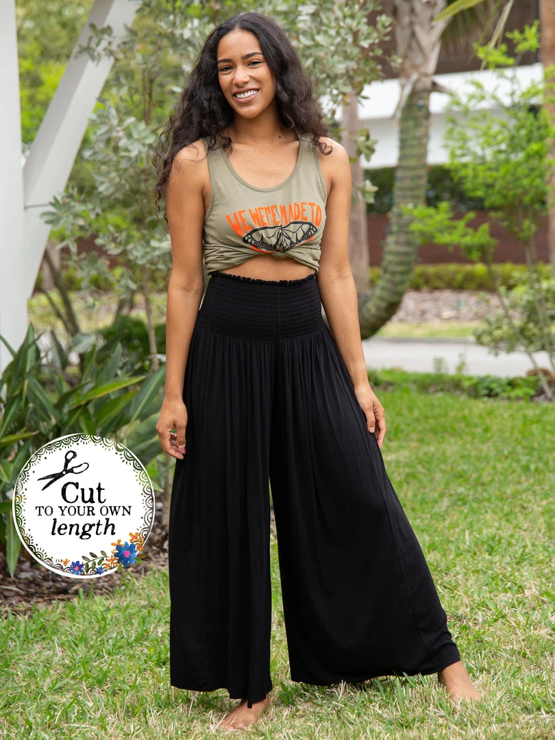 Meet the comfiest pants ever! Our Make A Move Palazzo Pants have a wide leg silhouette, a smocked waistband, and the most flattering fit! The best thing about them is the raw edge hem so you can cut to your own length… they even look great cropped! They’re so cute paired with any of our tanks and tees or can easily be dressed up, making them perfect to wear no matter the occasion! You’ll literally want to wear them every day!