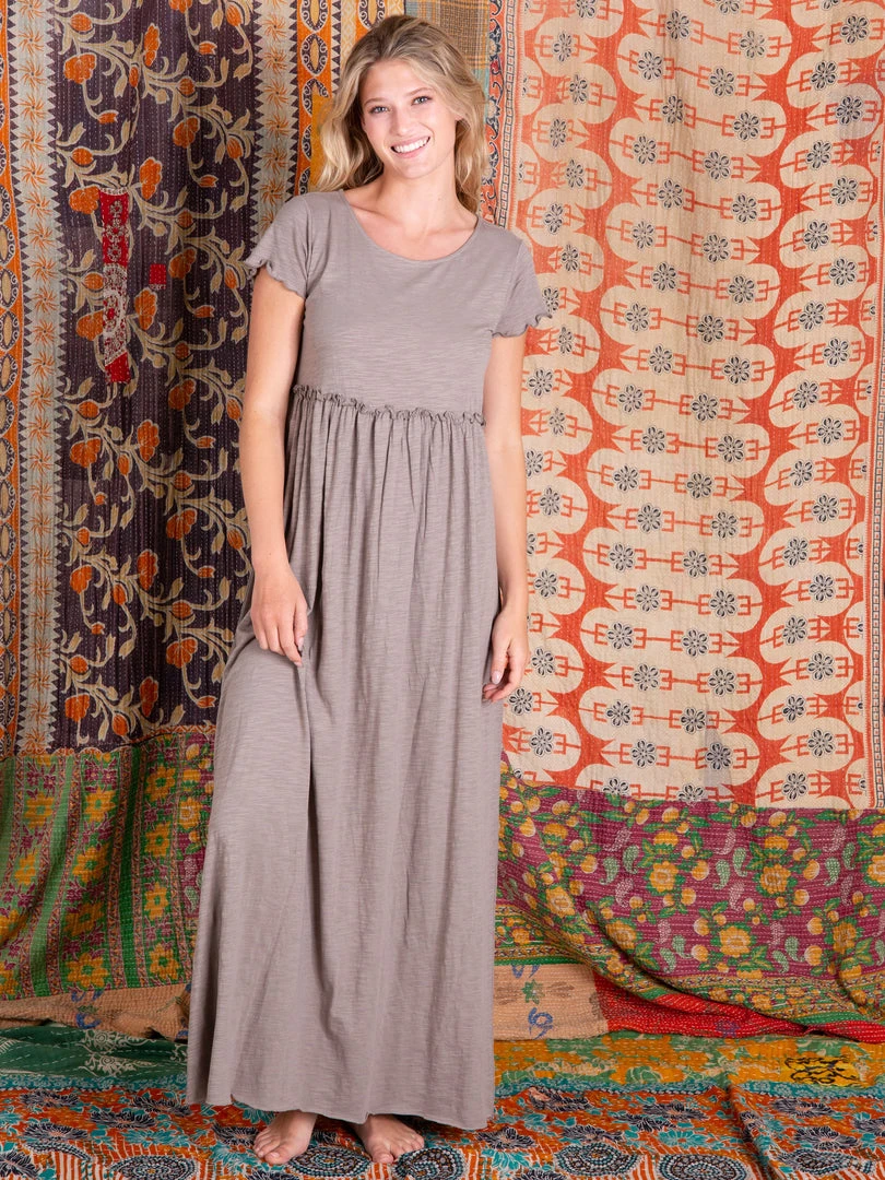 The Melanie Maxi Dress is simple and classic. It features an empire waist with a pretty ruffle detail, and is made from soft cotton slub material. It looks cute paired with one of our sweaters or your favorite jean jacket… and our favorite part is that you can cut it to your own length!