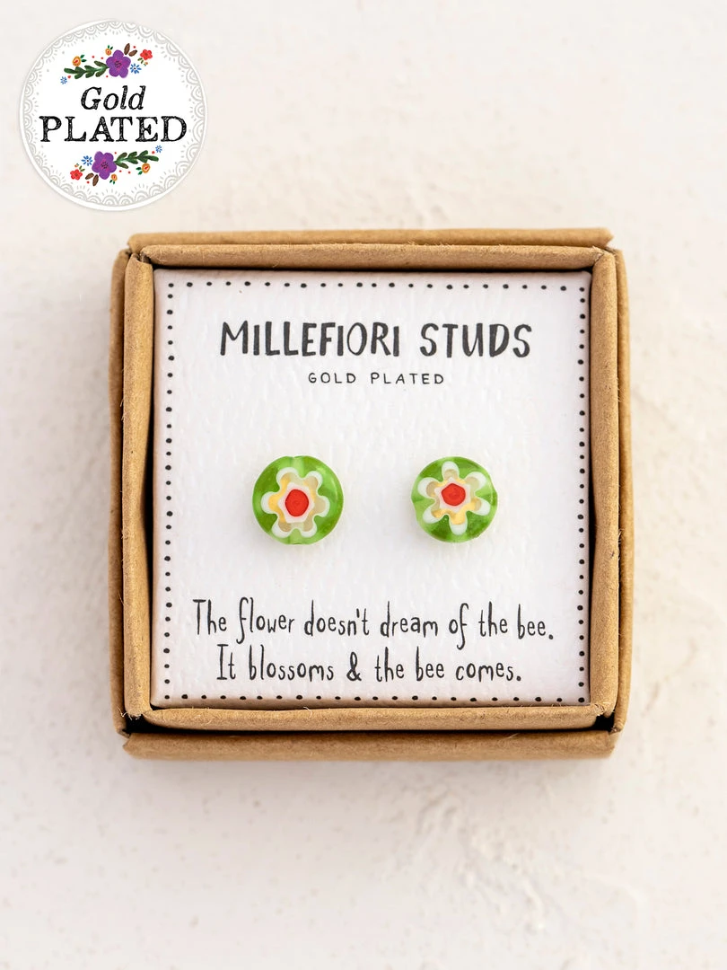 Millefiori means “thousand flowers” and the technique used to create the glass beads for these Millefiori Bead Studs, gives them the fun and unique flower shape! No two beads will be exactly the same, which is so cool! They’re so pretty and special, we love wearing ours… and you can never have too many pairs of earrings!