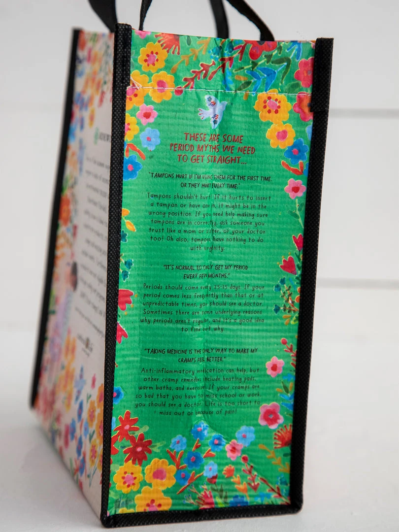 Our friend, Jan Healy, founded an organization called Renewing Dignity, whose mission is to eliminate “period poverty” through menstrual product distribution, education and advocacy. When we heard Jan’s idea, we couldn’t wait to help her! Patti, Natural Life Founder and CEO, joined the Renewing Dignity Board of Directors and started brainstorming ways to help this amazing organization! After putting our heads together, we decided to make the cutest Period Pouches and this Happy Bag to carry period supplies in. This Happy Bag is made with recycled water bottles and never get dog-eared so you really can use it forever! It features a sweet sentiment on the front, facts about Renewing Dignity and period poverty on the back & an incredibly informative list of period myths written by board member Dr. Marta Perez-Chomat on the sides of the bag. It’s the kind of information that every woman wishes they had as a young woman. The best part is that 10% of the proceeds from these products are donated to Renewing Dignity to help their mission!