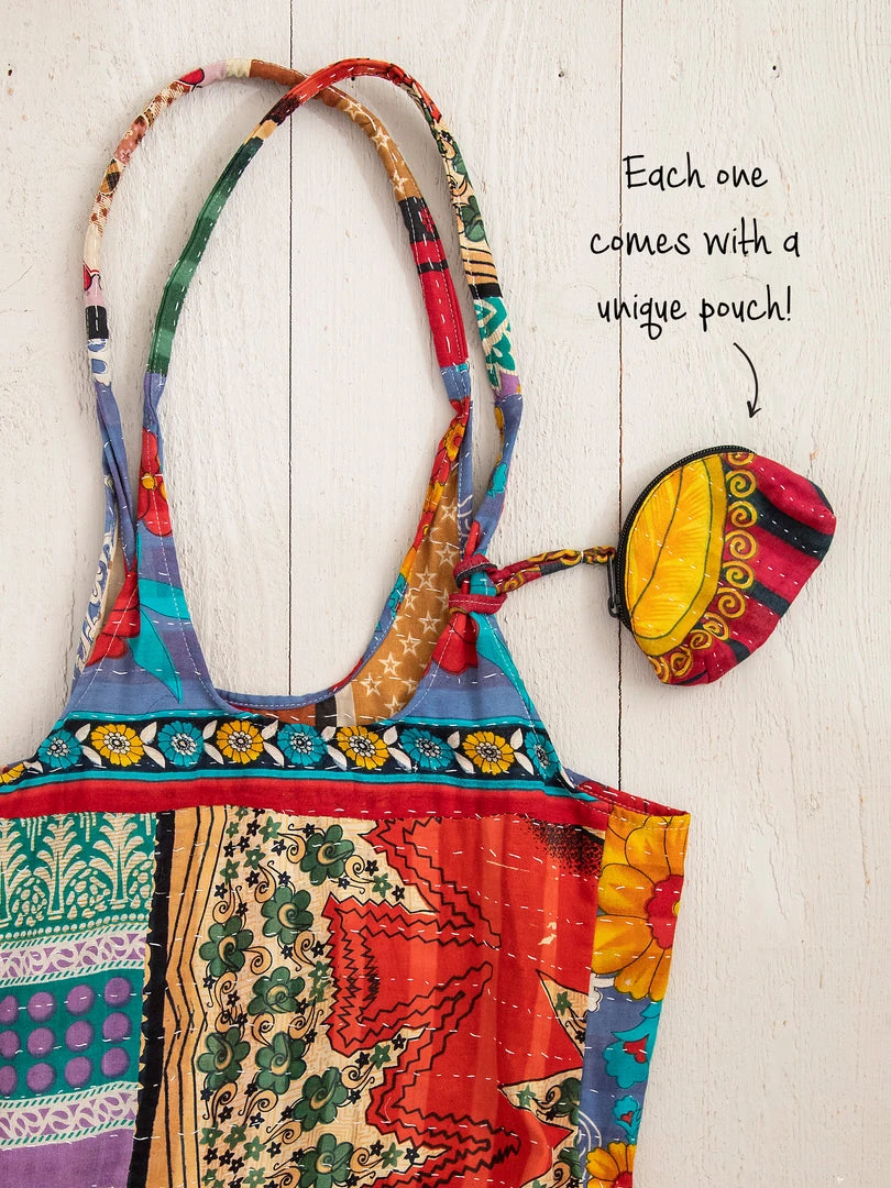The Kantha Tote Bag is made of Kantha blankets, so no two bags are the same! It’s 100% cotton and each print is so beautiful and unique. It’s meant to be slouchy and comes with a small pouch that varies in color and pattern, too! It’s such a one-of-a-kind bag and makes a fun gift for someone you love!
